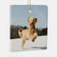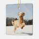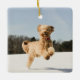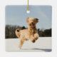 Enthusiastic goldendoodle runs happily through a field of fresh snow in late winter.