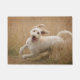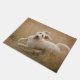 Goldendoodle, tongue out, ears flopping, runs through tall grass.