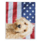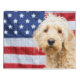 Goldendoodle sits proudly in front of the American flag on Memorial Day.