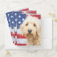 Goldendoodle sits proudly in front of the American flag on Memorial Day.