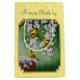 A pair of male and female North American goldfinches sit on the branches of an apple tree covered with pink spring blossoms while a third goldfinch perches on the edge of a woven wooden basket filled with freshly picked flowers. Accented with a matching sunny yellow background.