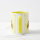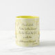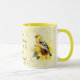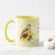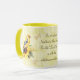 Yellow gold finch Bible verse mug. "Be not afraid, neither be thou dismayed, for The Lord Thy God is with thee whithersoever thou goest." Joshua 1:9. Yellow damask background, calligraphy, butterflies and gold finch images. Your choice of many different mug/cup styles, colors and sizes. There is a matching calendar towel.