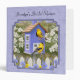 A pair of American Goldfinches perch on a cute purple birdhouse in a beautiful spring garden filled blue and yellow daisies lining a white picket fence. In the background is a lovely jacaranda tree covered with purple blossoms, surrounded by flowering dogwood. All on a matching lavender patterned background. Original artwork created by wildlife artist Crista S. Forest.