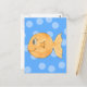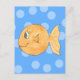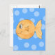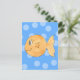 A cute swimming goldfish cartoon image on a blue pattern background.