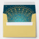This exotic teal and goldtone A7 envelope has a large central gold scroll circle medallion pattern on the inside with ornate swirled hearts detailing and gold stars and dots that lay over top of a dark teal blue background with another layer of fine bright aqua blue swirls and scrolls on it that match the Indian inspired wedding and engagement invitations shown below. Customize it with your own return address. If you want to change sizes, please email niteowlstudio@gmail.com to have one made up.