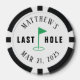 These custom poker chips feature the playful phrase "Last Hole" along with a golf flag image, making them a fun addition to a golf-themed bachelor party. Personalize them with the groom's name and date for a unique and memorable keepsake. Ideal for the groom and his friends, these poker chips add a humorous and personal touch to any pre-wedding celebration.
