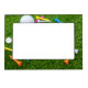 Golf ball and colourful tee are on green grass magnetic frame