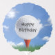White golf ball on a red tee in green grass with sky background for a birthday.