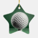 A white golf ball on a white tee in front of a green background on both sides of a ceramic star ornament.