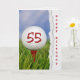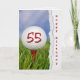 white golf ball on red tee in grass and blue sky background with torn edge border for 55th birthday