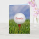 Close up of golf ball on red tee in green grass for Cousin's birthday.