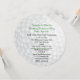 Unique round Pre Wedding Day Festivities Invitation, with graphics of a white pitted pattern golf ball look. Personalize the black and green text to suit your golf party needs. Matching RSVP cards available.