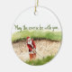Celebrate the holidays with a festive golf twist! This charming ceramic ornament features Santa Claus golfing on a green course, swinging his club, riding a golf cart, and surrounded by golf balls, golf bags, and cheerful Christmas decorations like ornaments, candy canes, and holly. The playful text “May the Course Be With You” adds humor and holiday cheer. Perfect for decorating the Christmas tree or gifting to golf lovers. Bright, modern watercolor style with vibrant holiday colors.