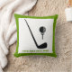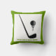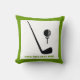 Golf club and ball black, green throw pillow showcasing that features a minimalist icon of a black golf club and ball and your text on white background with green border. This modern, minimalist design makes a perfect gift for golf players - golfers - or just golf lovers in your life. See lots of designs at our Sports Gifts store.