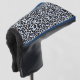 This golf club cover is shown in black with a blue animal leopard print accent and blue piping.