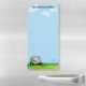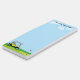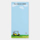 This pretty magnetic notepad design features a yellow golf cart on a green golf course, a golf bag and clubs, and a red flag. Clouds in white against a blue background.
