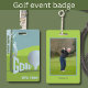 This golf event participation badge is suitable for small self-organised golf tournaments, or for participants to use for memory collections and track record analysis. It features a modern design of golfer and golfball on the front, with the word 'golf" in large text on a green blue background. On the back, there is space for a photo.