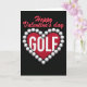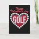 This greeting card features a deep black background with a large red heart centered on the front, and the heart’s edge is traced with a neat ring of small white golf balls that show tiny dimples against the smooth red shape. Inside the heart, the word “GOLF” sits in all-caps white sans-serif letters, placed squarely in the middle like a confident label. Above the heart, “Happy Valentine’s day” appears near the top in a pink-red cursive style, arcing gently across the dark space. The strong contrast of red, white, and black keeps the design focused, while the golf-ball border reads like a sweet, sporty frame that hints at shared rounds and inside jokes 🥰. Even lighting gives the golf balls a slight shadow and rounded depth, making them look almost sculpted around the heart ❤️. The layout stays simple and centered, with the top line of text floating above the heart and the single word inside acting as the main focal point. The final look is a red heart outlined in white golf balls, with pink-red cursive text above and “GOLF” in white at the center.