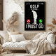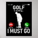 This clever illustration mimics a smartphone incoming call screen, with a time display, Wi-Fi, and battery icons at the top. The "caller ID" boldly states "GOLF" in large white letters, followed by "Is Calling..." in a smaller font. A distressed white silhouette of a golfer mid-swing is prominently featured in the center. At the bottom, a red "DECLINE" button with a phone icon and a green "ACCEPT" button with a phone icon are displayed, leading to the resolute statement "I MUST GO" in large, distressed white letters. The overall design humorously captures the irresistible pull of the golf course.