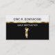 Classy golf lessons or instructor business cards with classy black and white background color, two side text layout you can customize and personalize, and a lot of style that includes a simulated gold golfer swinging action silhouette design element. Designed for a golf instruction, lessons, school, or trainer.