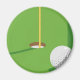 Illustration of a golfing green with the hole in the ground and a golf ball ready to knock in. Image available on various gifts and products. Magnets.