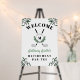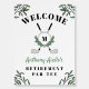 Golf themed retirement party welcome sign with a golf club monogram with the retiree's initial, greenery, and the name in a modern green script.