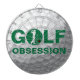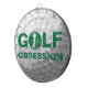 Golf obsession customizable dartboard. The design features a giant golfball and the words golf obsession in green where the "o" is a silhouette of a golfer swinging a club. Perfect for anyone who loves golfing and a great addition to any man cave. Great gift for him. Perfect for the obsessed golfer or those addicted to golfing.