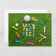 Golf Par tee party invitation with golf ball and colourful tees are on green grass.
