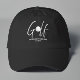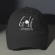 A stylish golf design with playful edge: “Golf” appears in modern handwritten script, with the “O” replaced by a golf ball for bold visual impact. Beneath the wordmark, two lines of customizable sans-serif text allow for team names, club titles, or any personal phrase—plus a smaller line for est. year or alternate wording. Set on a black dad hat with crisp white text, this design is fully customizable in color and layout, making it perfect for tournaments, league gifts, or everyday style on the green.
