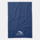 Personalized name in classic font on a navy blue kitchen towel with a ring clip and unique golf ball and golf club logo graphic design is a great golf gift or keepsake for a golfer, caddy, or golf club membership award.