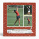 Make this a special gift by adding photos of your golf partner. Red background with white club irons and golf ball pattern. Three photo templates on front. Golf balls accent white banner under photos on front and on spine. Another photo template on back.