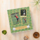 Make this a special gift by adding your photos of your golf buddy. Yellow golf range pail basket pattern background on green. Four photo templates, three on front, one on back. A club iron and putter accenting a yellow banner under photos on front and on spine.