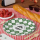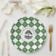 A stylish, round party plate perfect for a golf-themed event at a resort. The plate’s background features a classic green and white argyle pattern, evoking a preppy, golf-inspired look. In the center of the plate, the resort’s logo is prominently displayed, giving it a professional yet celebratory feel. The logo stands out, surrounded by the clean, crisscrossing lines of the argyle, making it a focal point. The plate’s overall design combines elegance with a playful golf theme, setting the tone for a refined yet fun resort gathering.