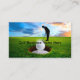 Scenic golf business cards in a clever design with golfer silhouette and golf ball in the hole against a beautiful sky. Designed for anyone that does golf lessons, golf training, sells golf equipment and supplies, or a golf website.