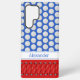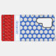 Golf balls create a bright polka dot pattern on a blue background on this phone case. There is also a white band with blue stripes for you to personalize with a name or other text. A further golf-themed pattern is created using golf clubs on a red background.