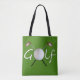 Tiled golf tote bag has criss crossed golf clubs and the word "Golf" with a golf ball in the center in place of the "O" on a blue shirt.. Text and/or pictures can be added and the color of the bagt can be customized.