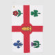The flag of Montreal prominently displays a bold red cross dividing a white field into four quarters, each adorned with a floral emblem representing the city’s founding communities: the fleur-de-lis for the French, the rose for the English, the thistle for the Scots, and the shamrock for the Irish. At the center sits a vivid red maple leaf symbolizing Canadian unity and multicultural pride. This meaningful design adds a unique and eye-catching flair to the towel, making it a standout addition to your golf gear.