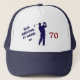 This birthday at 70 hat shows a navy blue silhouette golfer taking a full swing. The blue and red text on either side of the image says "Still DRIVING IT HARD at 70". Sure to be a conversation starter for any man who loves to play golf!