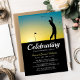 Funeral memorial invitation featuring a golfer with a sunset backdrop and a celebration of life template that can easily be personalized. A great tribute invitation for anyone who loved playing or watching golf.