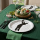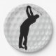 Paper party plate with image of a golf ball and a silhouette of a golfer in black and white.