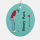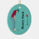 Teal personalised golfer, wearing a cap, deep red shirt and blue pants, putting a golf ball into a hole Christmas ornament.