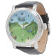 This Golfing Watch features a golf course background with a sand trap and golf flag, a red golf cart, a blue golf cart both with golf bags. Decorative text is Golf. The watch numbers can be deleted, if you prefer your watch without them. Perfect gift for the golfer in your life. Choose the style and color of your watch!