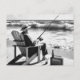 This image depicts an older man seated on a wooden chair at the beach, engaged in fishing. He is wearing a hat and appears relaxed, holding a fishing rod. Beside the chair, there is a small cooler and a portable radio on the sand. The ocean waves are visible in the background, suggesting movement. The sky is filled with clouds, adding to the serene atmosphere of the scene.