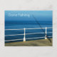 Photograph of a fishing pole leaning on railing on fishing pier. Customizable text.