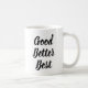 Good Better Best Motivational Coffee Mug. A simple design with script typography quote "Good Better Best" in black on white. The text can easily be personalized. A sweet reminder for you. A Wonderful Morning Motivation gift idea for your family and friends.