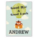 This very cute cartoon illustrated card features an adorable woodland fox with a cute top hat riding in the cute hot air balloon up in the clouds! With big black lettering over the top that reads Good Bye and Good Luck with room below for you to edit with any name you wish.