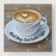 Unique gift for coffee lovers is this coffee quote country kitchen clock- Photo background of a classic restaurant white saucer and cup of coffee with a heart made from cream on rustic wood counter. Reads 'Good Days Start With Coffee' in cursive, hand lettering curved over the bottom of the saucer. Silver color clock face numbers. Fun housewarming gift for coffee drinkers, gift for barista or for retired couples. Would also be cute coffee shop clock or clock for country breakfast restaurant or bakery.
