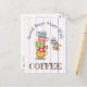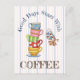 A playful design that starts with a background of soft pink, blue and yellow pastel stripes. The main feature is this colorful stack of coffee cups, the the top one tipping over. The text reads "Good Days Start With COFFEE". On the back of the postcard there is a smaller version of the tipping coffee cup alongside of the return address. Also there are ruled lines on the back for an address. This postcard can be customized.