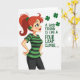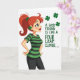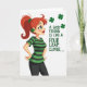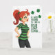 The front design shows a stylized woman on the left in profile against a white background, looking up and to the right with a soft, knowing smile that feels like she’s sharing an inside joke with a close friend 💚. Her auburn hair is pulled into a high ponytail that arcs behind her, and a small four-leaf clover appears both in her hair and as a matching earring ☘️. She stands with hands on hips, wearing a fitted T‑shirt with green-and-black stripes and sleek black leggings, giving her a confident, friendly presence. The color mix of deep greens, warm reds, and rosy cheeks adds a cozy, affectionate tone to her expression and posture. On the right side, the message “A GOOD FRIEND IS LIKE A FOUR LEAF CLOVER...” is set in green lettering, spaced to fill the open area beside her gaze. Beneath the words, three evenly spaced four-leaf clovers float in a neat row, echoing the clover details she wears. The layout leaves generous white space around the figure and text, with the green message and clovers standing out clearly beside her upward glance.