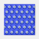 Many little evil eye charms in a repeating pattern with cobalt blue background